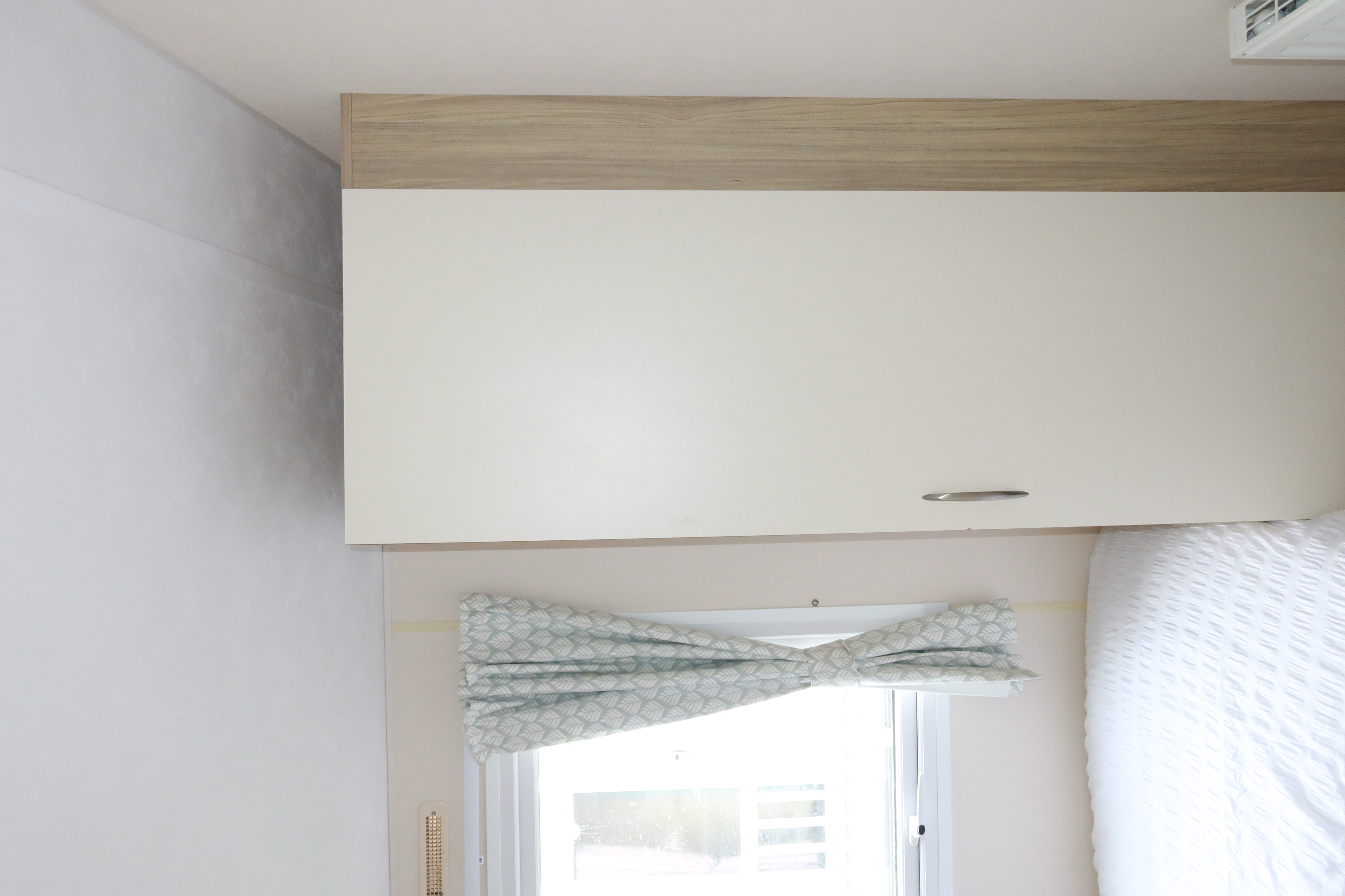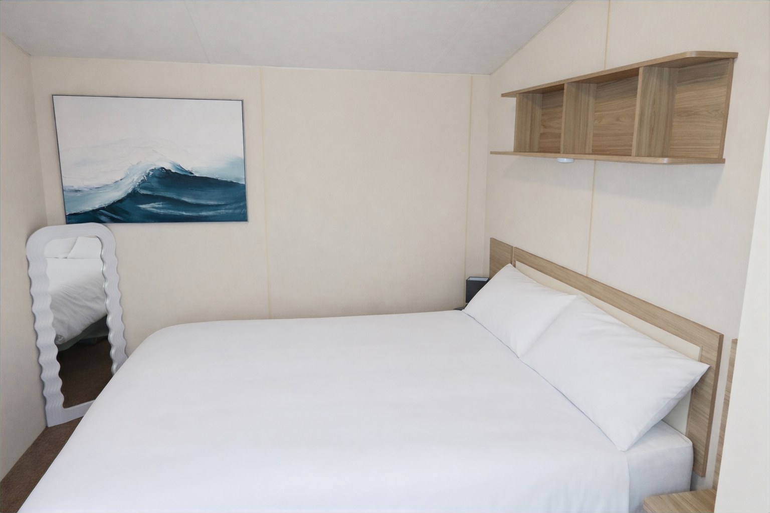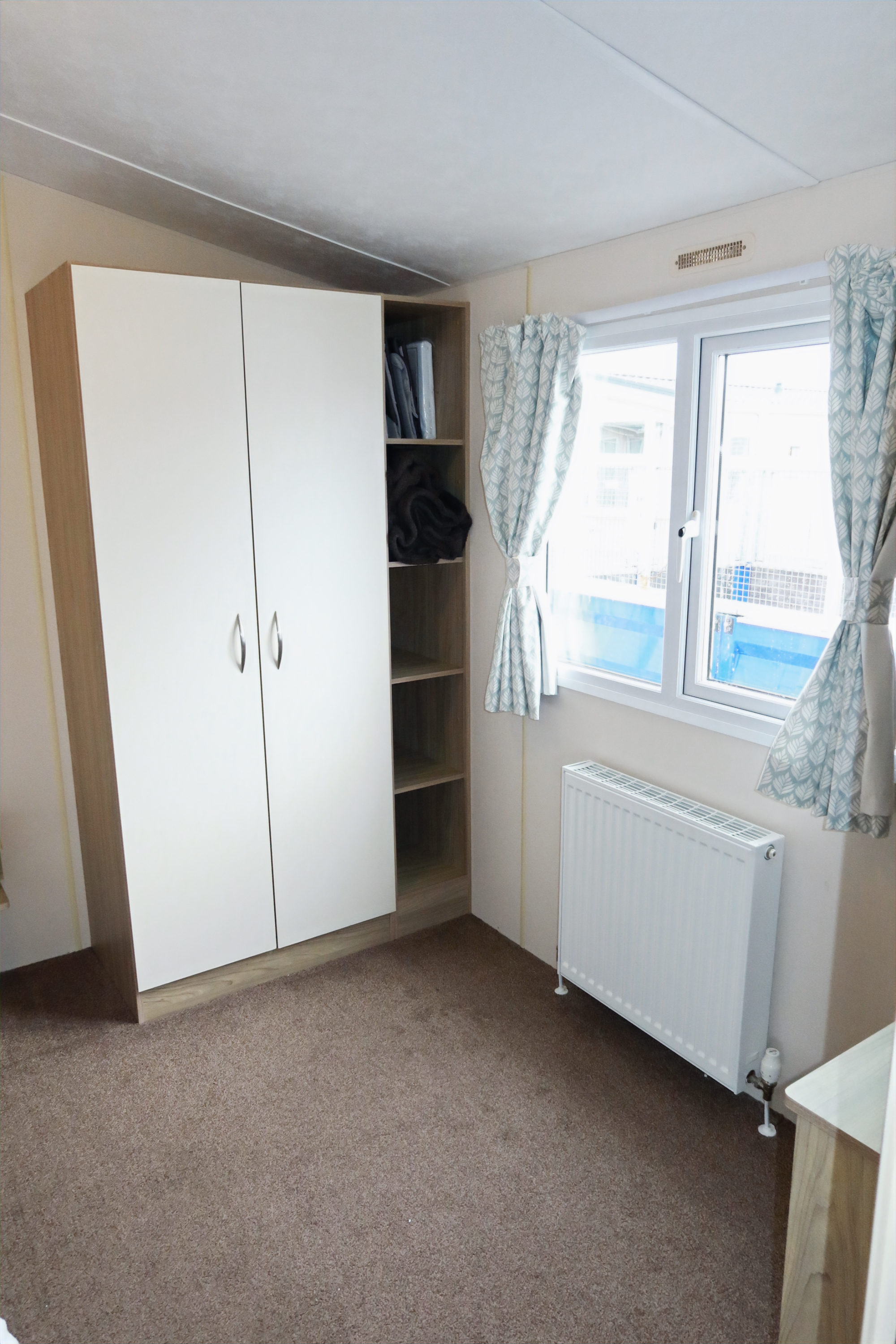 Sleeps 6 in 2 bedrooms: 1 double bed, 2 single beds, and a pull out double sofa bed. Storage is provided in the singles room and a wardrobe in the main bedroom with a mirror. Bedding is provided.