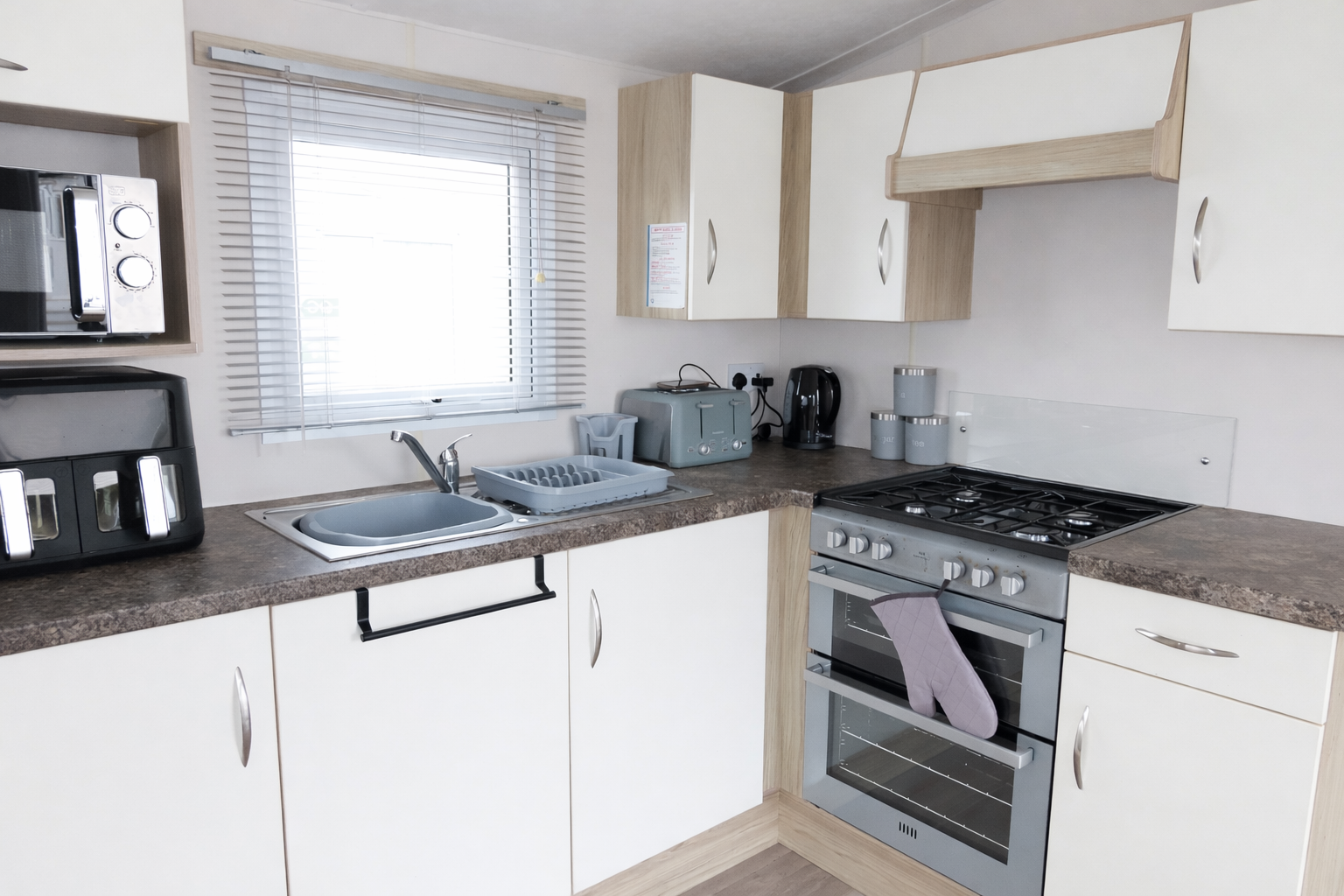Fully equipped kitchen with airfryer, cooker, fridge freezer, microwave, toaster, kettle and open dining space. Includes plates, bowls, cups, glasses, mugs, chopping boards, and cleaning products.